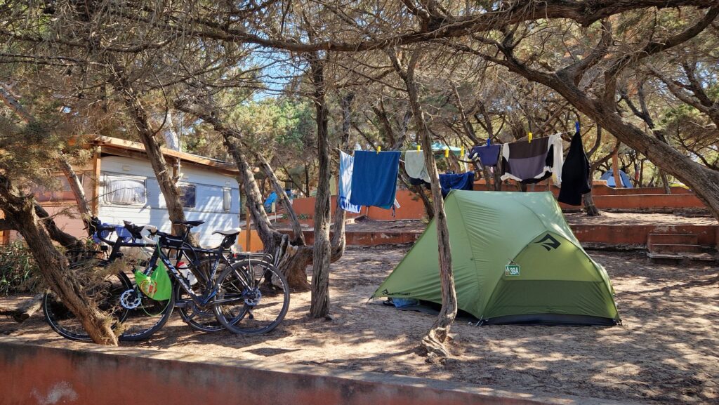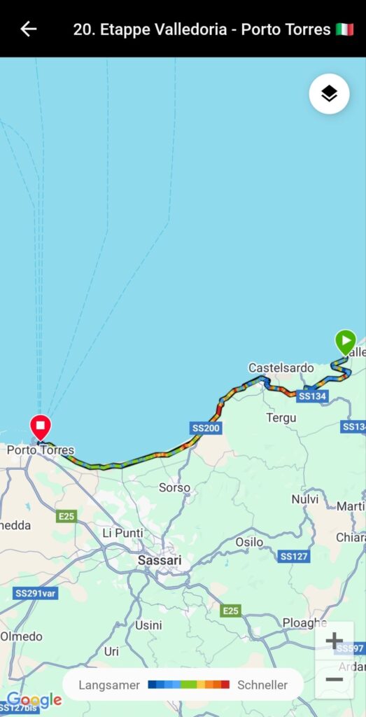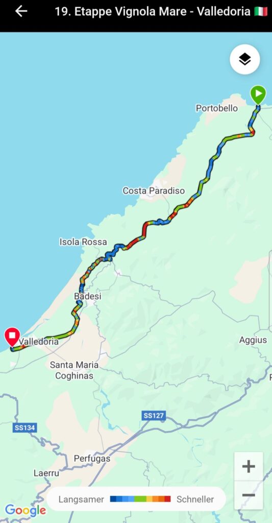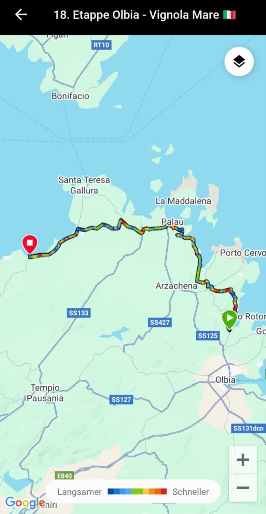 In Cugnana Camping haben wir uns bestens erholt, jetzt wurde es Zeit zum Packen und Weiterreisen 🚴♀️🚴♂️Wir haben die 18. Etappe aufgrund der Hitze (35 Grad ☀️) und der 800 hm etwas kürzer geplant (67 km). Ciao ciao Costa Smeralda, für unseren Geschmack zu hügelig und zuviel Schickimicki 😀Der Radweg führte uns durch einen (geschlossenen) Olivenhain 🙄Also mussten wir die Route ändern (nochmal mehr Höhenmeter 😅)..…und wurden mit dieser herrlichen Aussicht auf Palau belohnt 😎Geschafft 😅…Nach 68 doch sehr heißen Kilometern sind wir in Vignola Mare am Strand angekommen. Die 19. Etappe war so anstrengend, dass wir keine Fotos gemacht haben Es waren nur 40 km, aber mit über 500 hm. Und das bei 35 Grad ☀️! Wir sind größtenteils Landstraße gefahren, mit vielen Autos/LKWs, die häufig sehr knapp überholen (sorry, aber die meisten Italiener können echt nicht Auto fahren). Es ging rauf und runter 😅. Irgendwann sollten wir auf einer unbefestigten Straße weiterfahren…aus Schotter wurde eine Sandpiste, die unmöglich befahrbar war. Also wurde auch noch kräftig geschoben 🙄🙄🙄 Unglaublich wie man so k.o. sein kann nach 40 km 😅😅😅Auf dem Campingplatz in Valledoria bleiben wir nun 3 Tage, da die Fähre von Porto Torres erst am 11.08.2025 Richtung Frankreich ablegt. Wir nutzen die Zeit zum Wäsche waschen, zum Baden im Meer und vielleicht fahren wir auch mal nach Castelsardo 🏰.