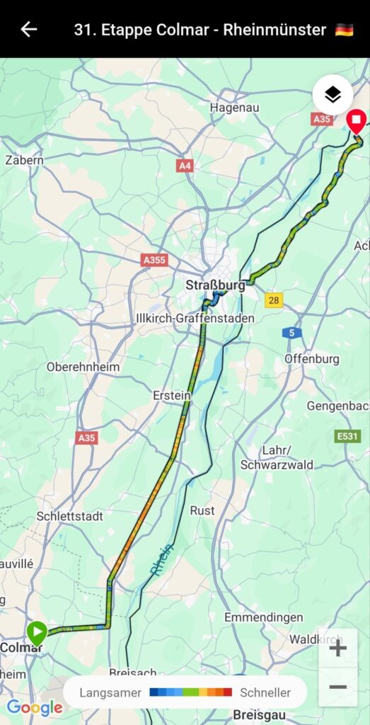 Hinter Straßburg sind wir über den Rhein zurück nach Deutschland gefahren. Die letzten 31 km gingen flach durch das Rheintal Richtung Rheinmünster.